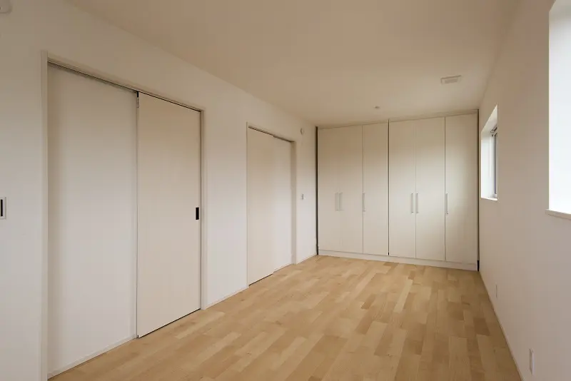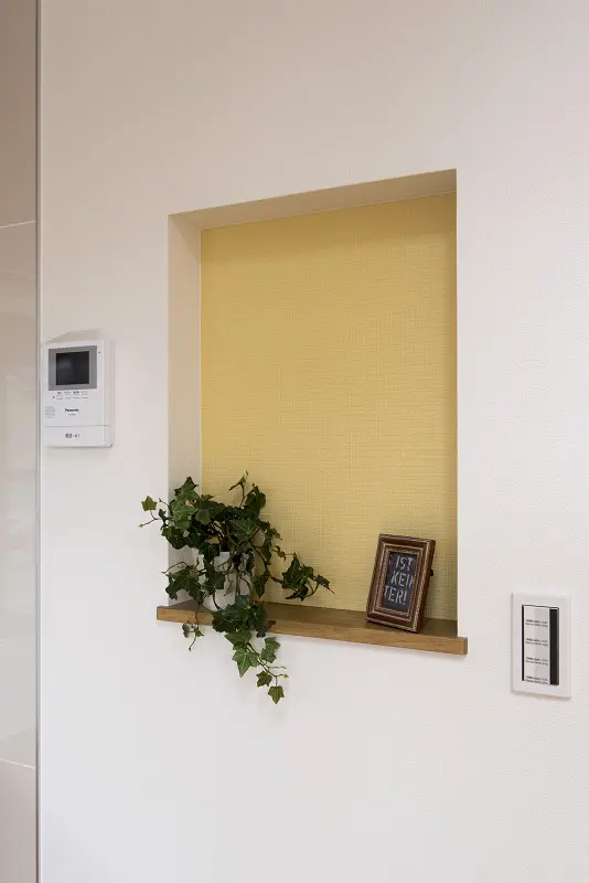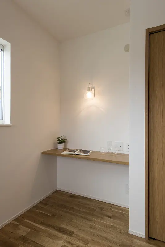 アクセントクロスや木質系の外壁を効果的に使って演出しています。 女性設計士ならではのインテリアコーディネートです。