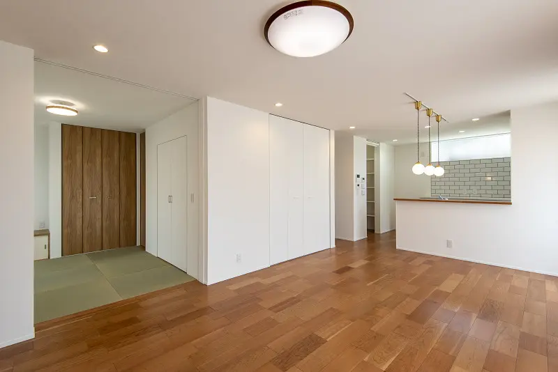 扉を開放するとリビングと連続する4畳半の和室のある家です。 普段は広々と使いながら、客間としての利用ができ効率的です。