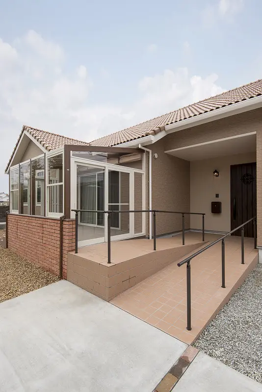 バリアフリーのスロープ・日差し抜群のサンルームで使い勝手抜群の外構になっています。 固定階段から上がるロフトが収納は普段の暮らしで大活躍します。