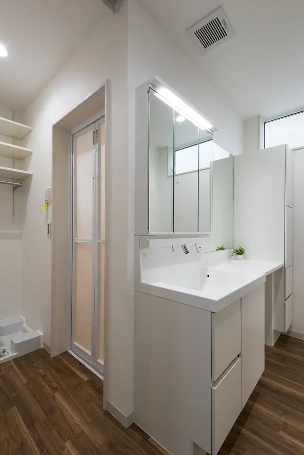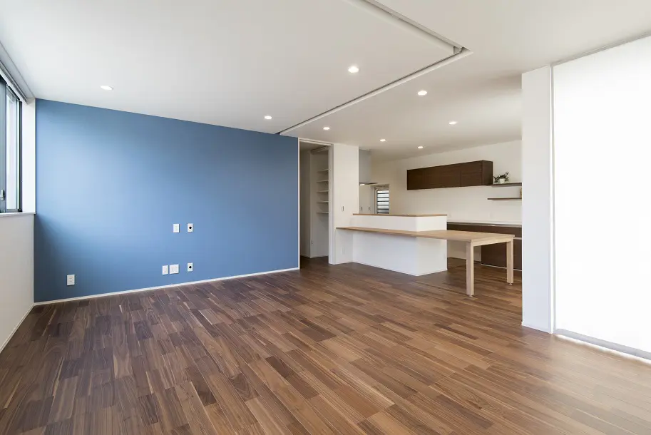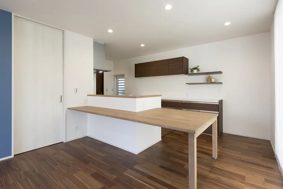 暖かい光に包まれる開放的なLDKをもつ二世帯住宅。 家族みんなで食卓を囲める造り付けのダイニングテーブルは、家族の時間や会話を増やします。