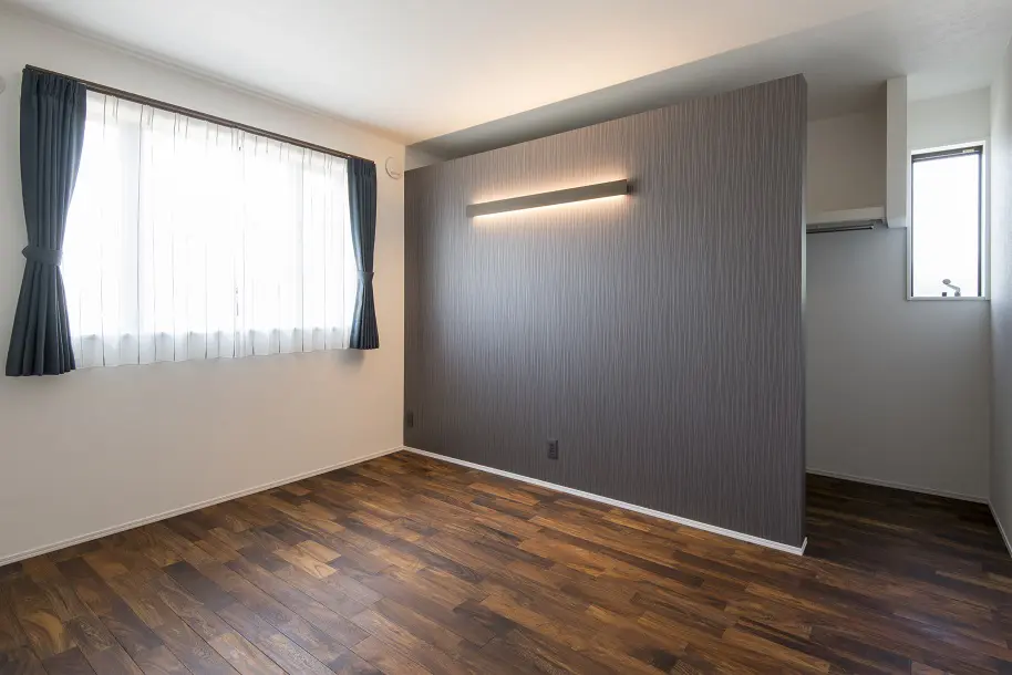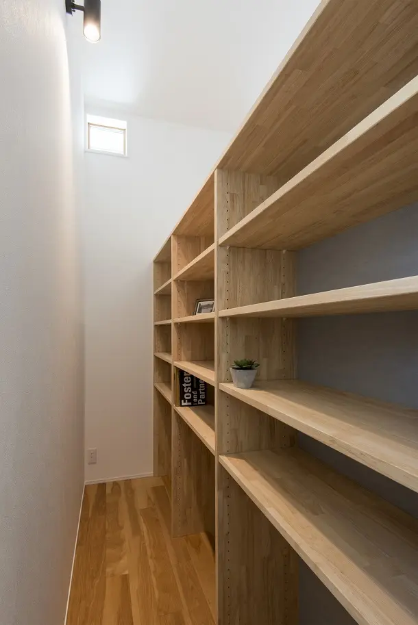 勾配天井で開放感を演出した明るいリビング。 腰壁で仕切られたブックスペースは、こもり感を感じられる居心地の良い居場所になります。