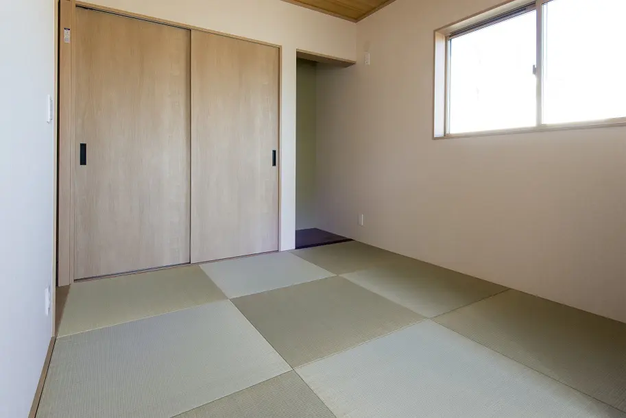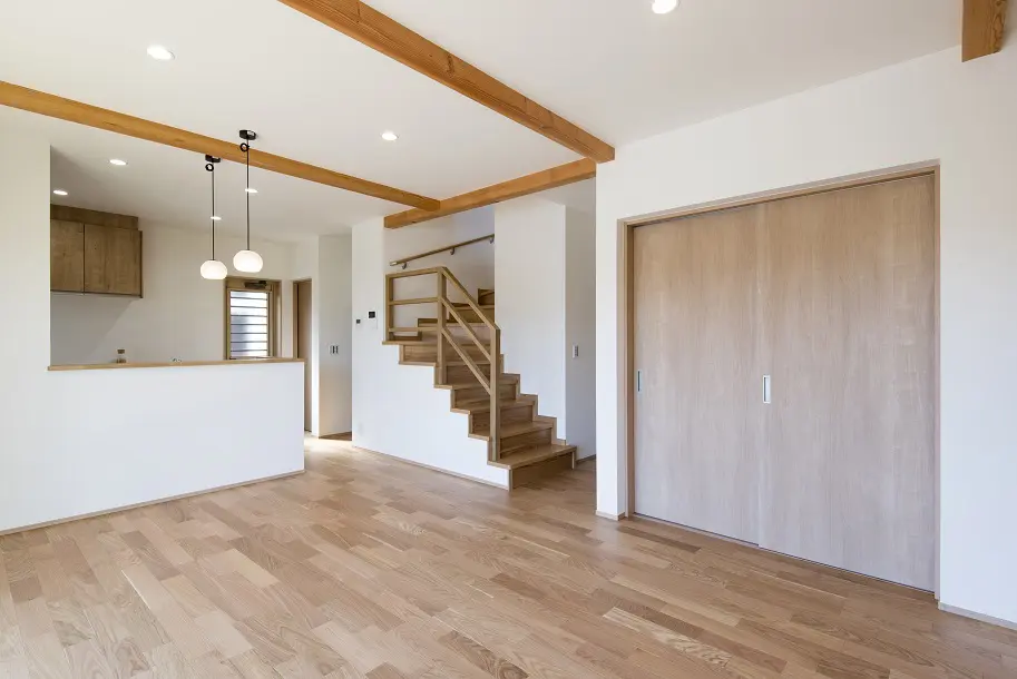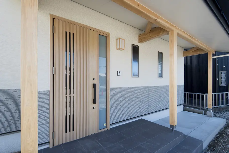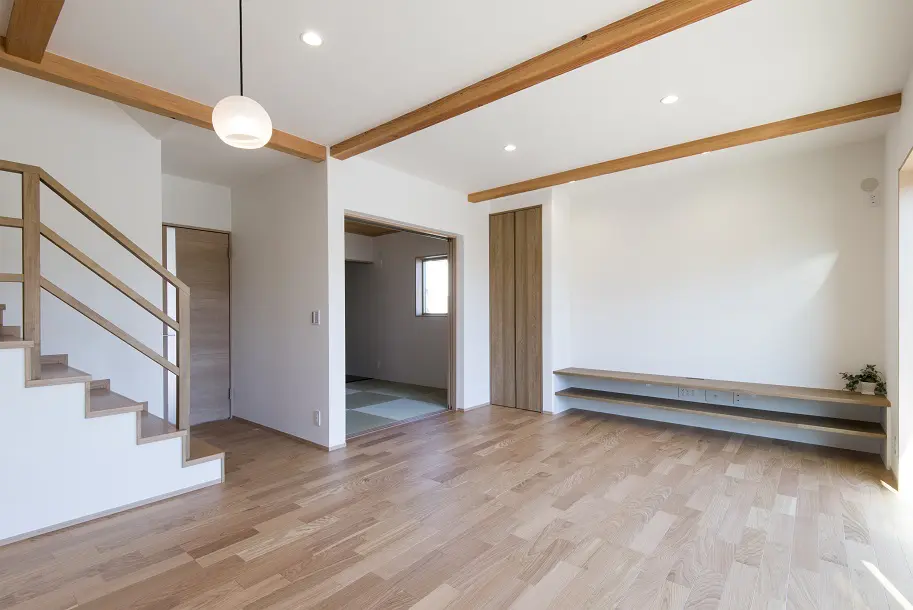 玄関の表し柱と梁が印象的な和風の家。 リビングと和室を続き間で一体に利用できる、い草香る心落ち着く住まいです。