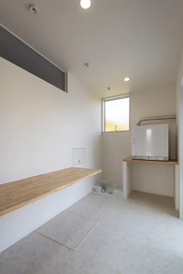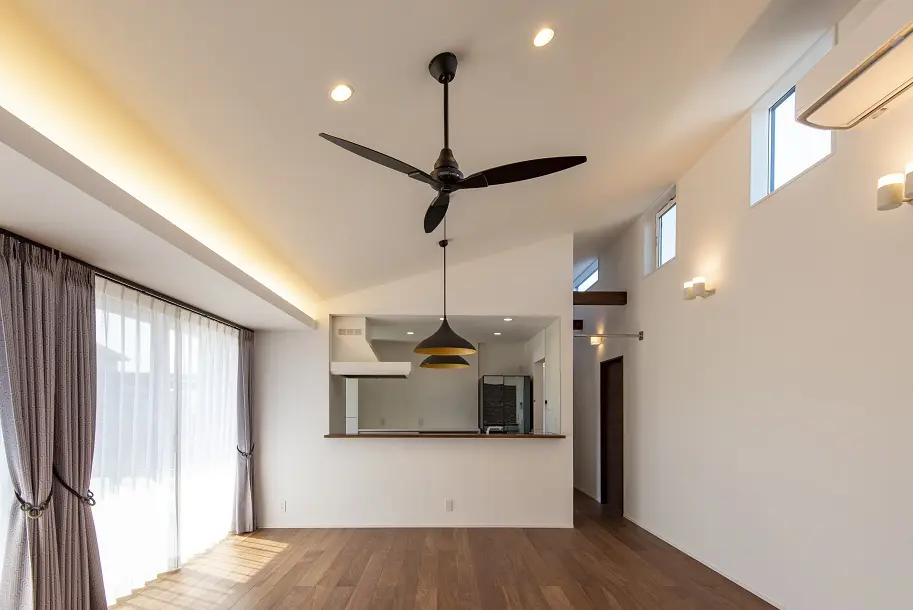 居室空間と収納空間を十分に確保した平屋の家。 夜は勾配天井を利用した間接照明で雰囲気良く、くつろぎ感を与えます。