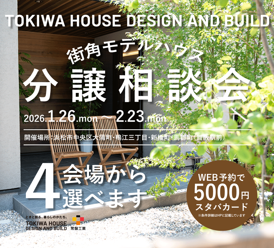 そして、自然エネルギーを最大限に活用して快適な空間を作る新発想のスマートハウス「TOKI:SMA[ときすま]」。TOKIWA HOUSE DESIGN AND BUILDでは、これら3つの住まいをご用意しています。